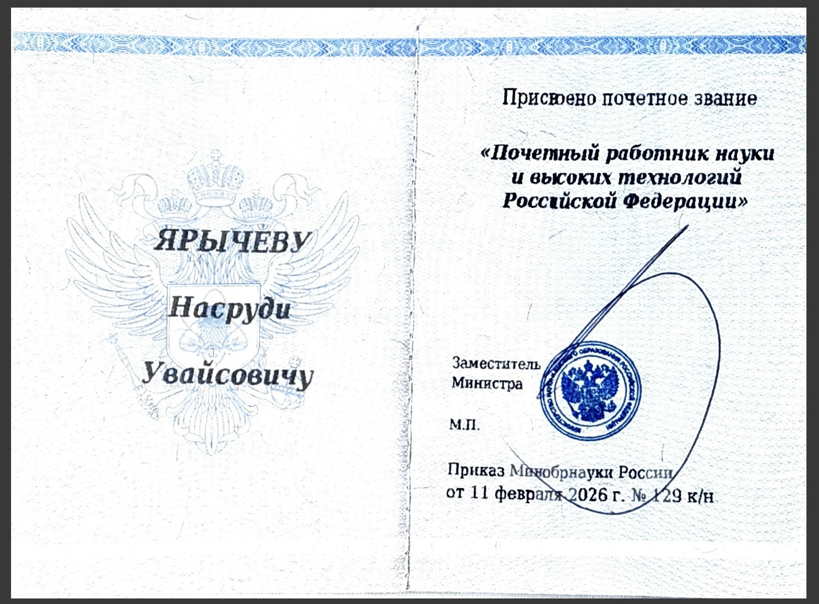 Приказом Министерства науки и высшего образования Российской Федерации № 129 н/к от 11.02.2026 года ЯРЫЧЕВУ НАСРУДИ УВАЙСОВИЧУ, члену-корреспонденту Российской академии образования, академику Академии наук Чеченской Республики, доктору педагогических наук, доктору философских наук, доктору культурологии, профессору, заслуженному деятелю науки Чеченской Республики, народному учителю Чеченской Республики, заслуженному деятелю науки Республики Ингушетия, проректору по учебной работе ФГБОУ ВО «Чеченский государственный университет им. А. А. Кадырова», присвоено почетное звание «ПОЧЕТНЫЙ РАБОТНИК НАУКИ И ВЫСОКИХ ТЕХНОЛОГИЙ РОССИЙСКОЙ ФЕДЕРАЦИИ».