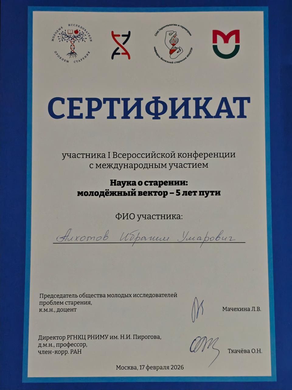 Алхотов Ибрагим Умарович и Эльдарова Хеди Исаевна, приняли участие в I Всероссийской конференции с международным участием «Наука о старении: молодёжный вектор – 5 лет пути».