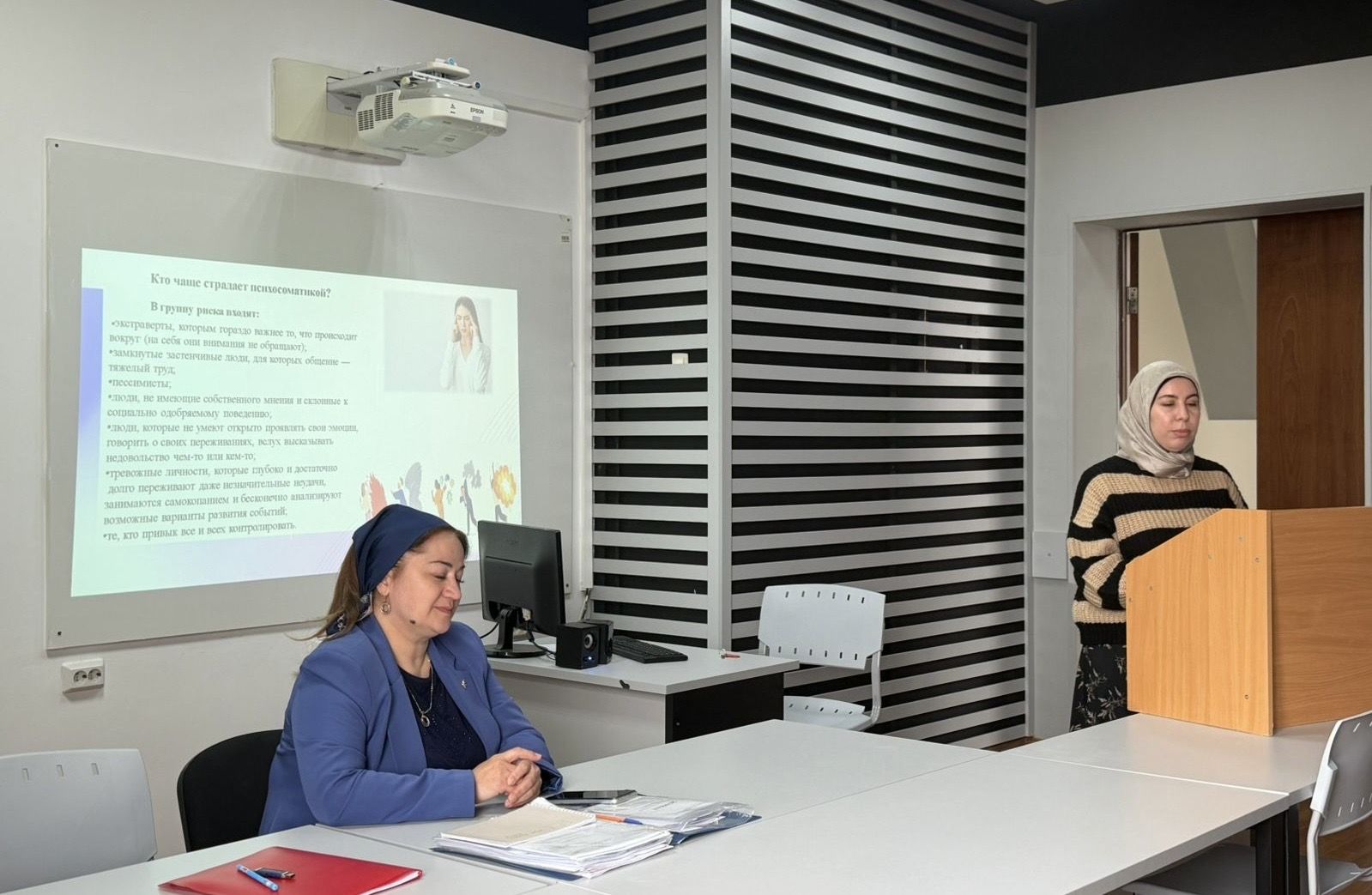 С основным докладом «Влияние психологического состояния на физическое здоровье» выступила доцент кафедры педагогики и психологии Киндарова З.Б., содокладчиком выступила магистрантка 1-го года обучения Хасуева Х.Г.