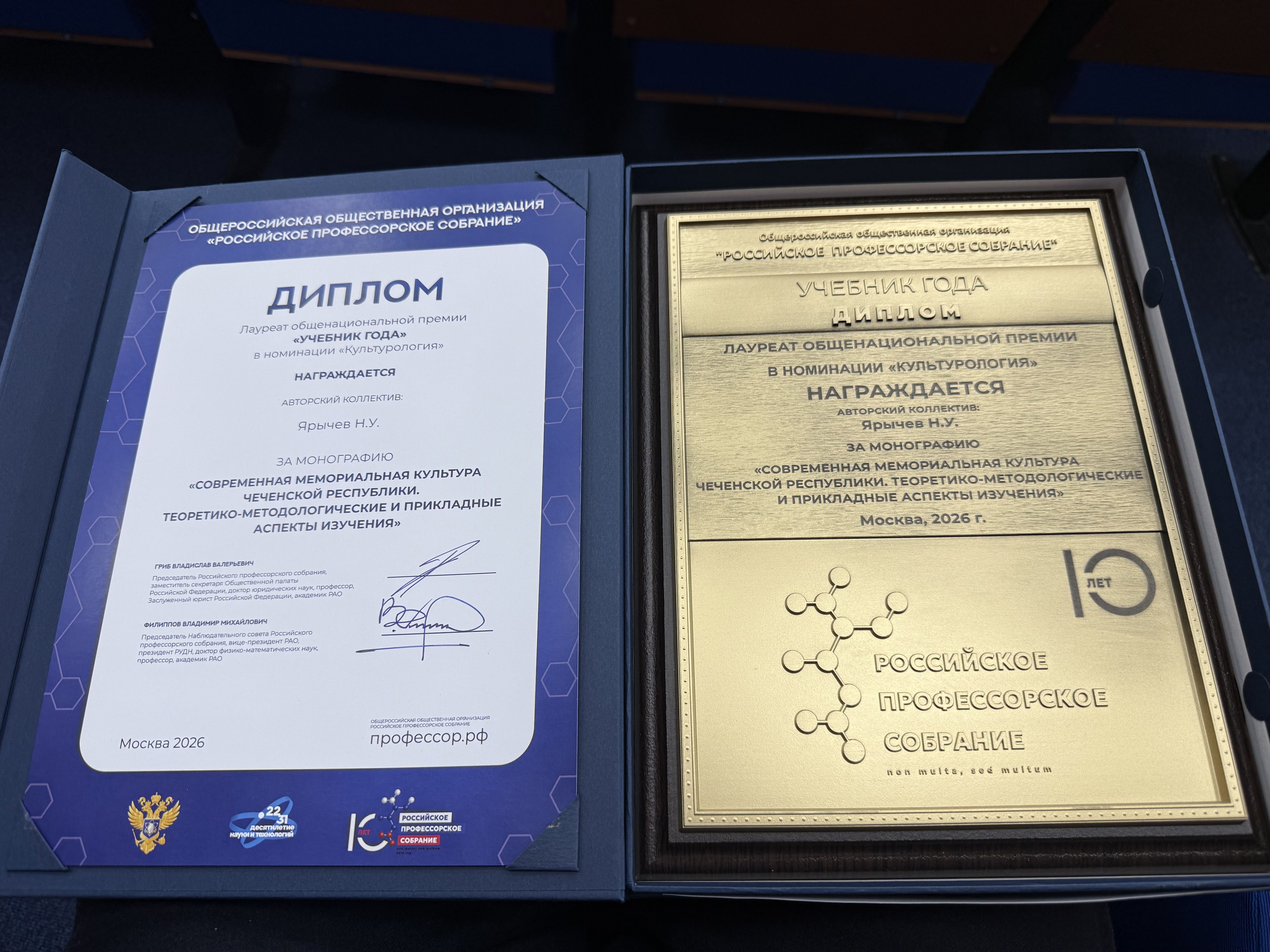 27 апреля 2026 года в стенах Российской академии образования состоялась торжественная церемония награждения победителей Общенациональной премии Российского профессорского собрания «Учебник года». Победителем научного направления «Культурология» стал Ярычев Насруди Увайсович, проректор по учебной работе Чеченского государственного университета им. А.А. Кадырова, член-корреспондент Российской академии образования, доктор педагогических наук, доктор философских наук, доктор культурологии, профессор, заслуженный деятель науки Чеченской республики, народный учитель Чеченской Республики, заслуженный деятель науки Республики Ингушетия.