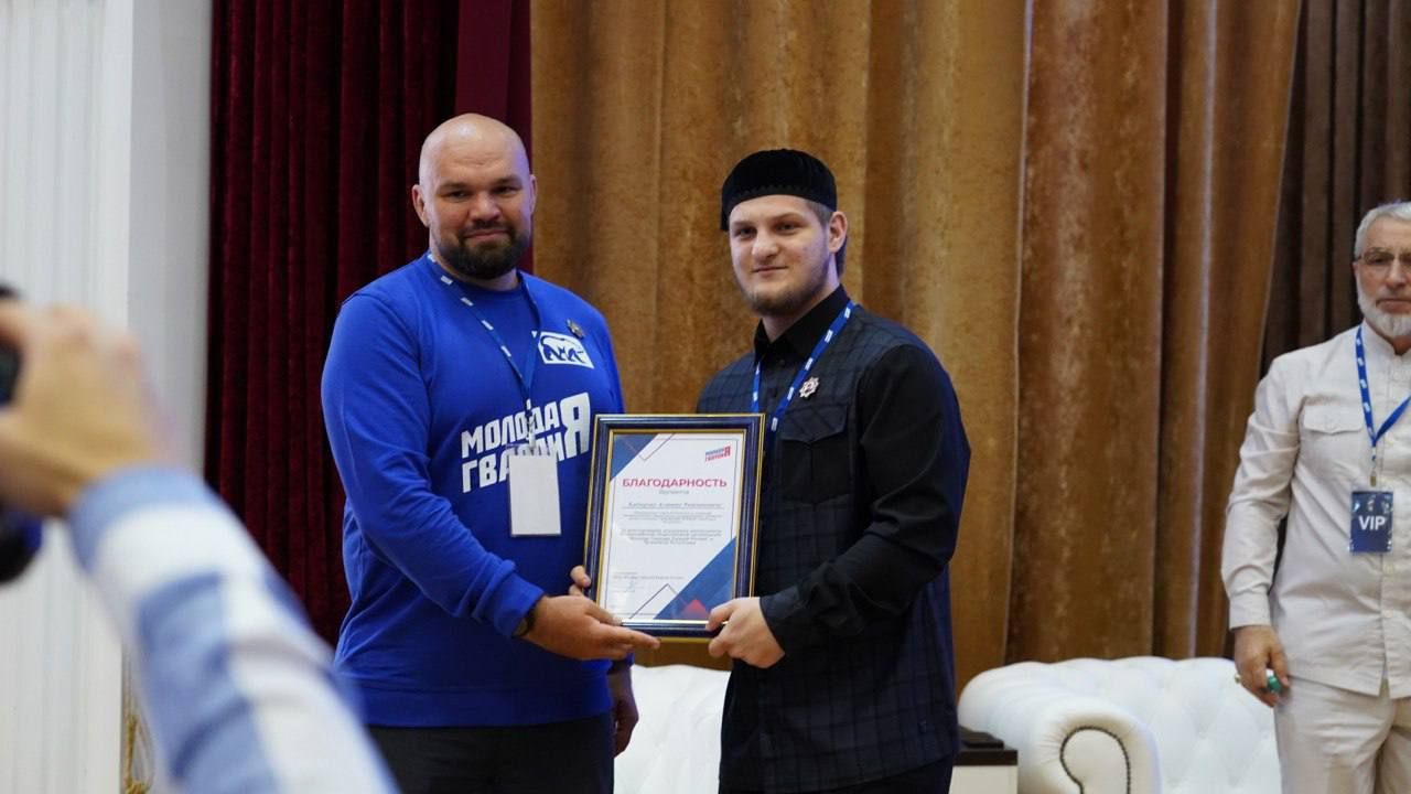 За поддержку проектов «Молодой Гвардии» председатель Координационного Совета МГЕР Антон Демидов вручил Ахмату Кадырову благодарственное письмо за поддержку проектов организации.