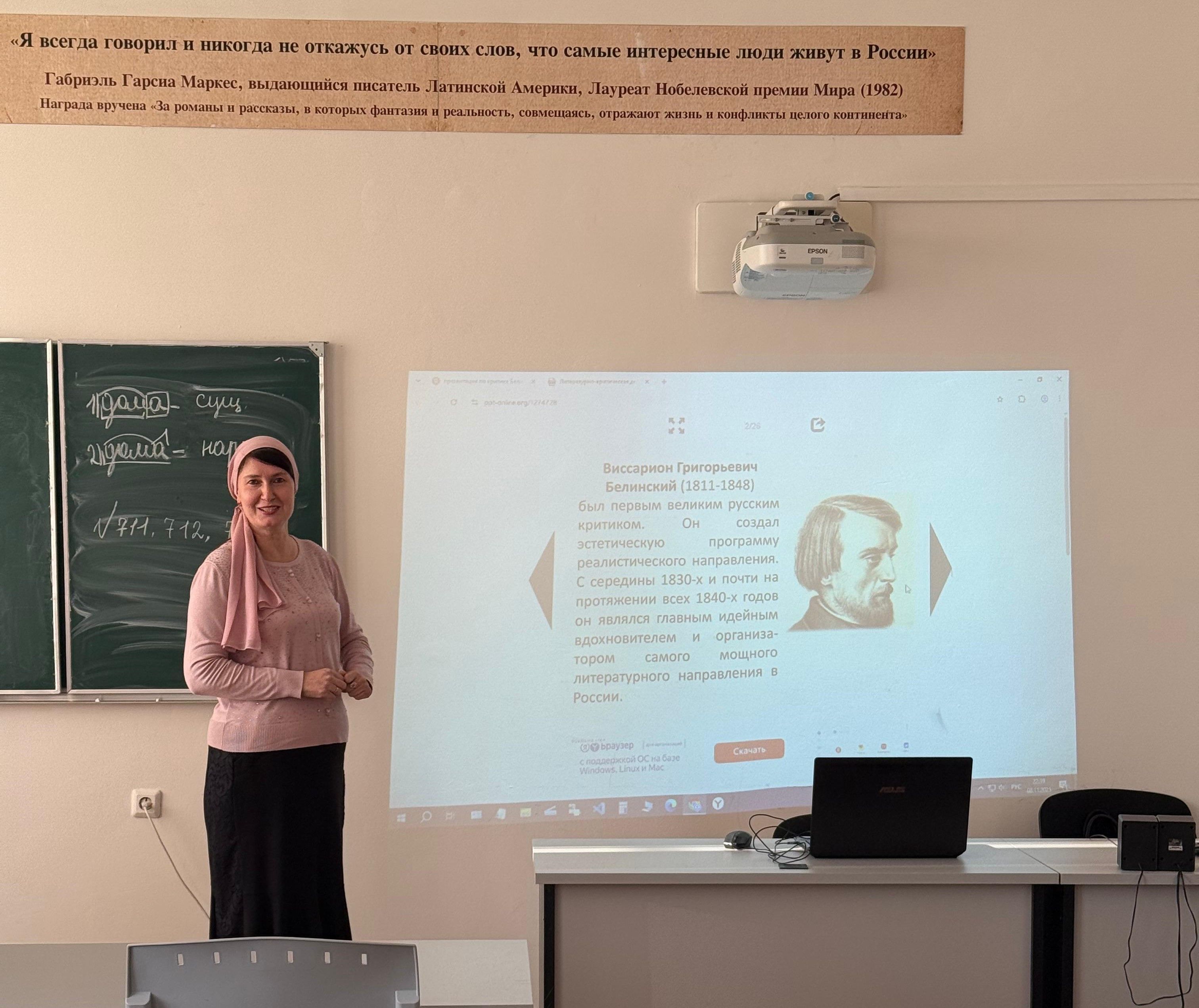 Темаева Х.Н. в начале занятия рассказала о том, что свою жизнь В.Г. Белинский положил на алтарь служения русской литературе и предал ей то исключительное значение, какое она занимает в мировой культуре и сегодня.