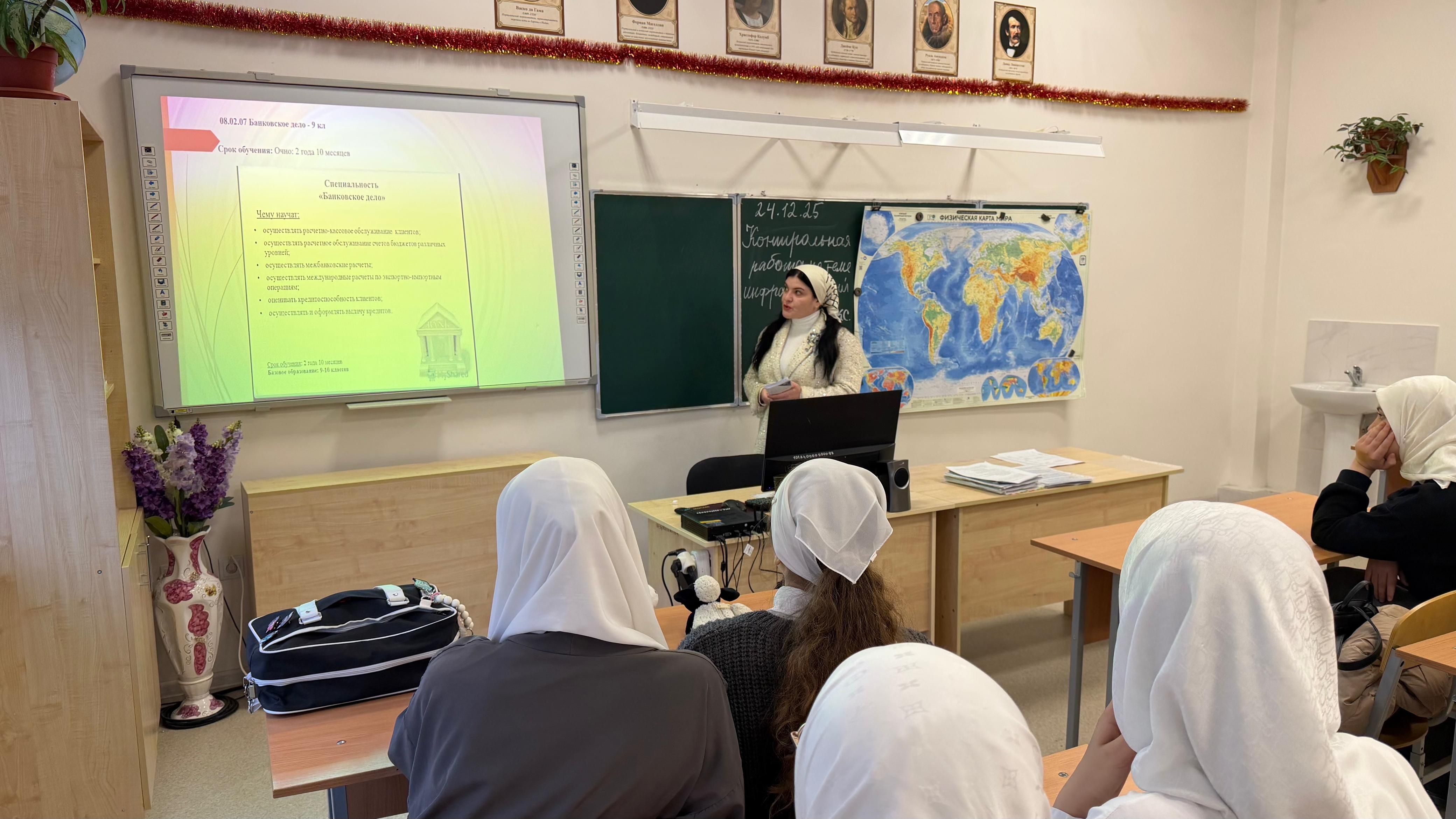 Преподаватель колледжа Цагараева Д.С. профориентационную работу в МБОУ “СОШ № 60» г. Грозного.